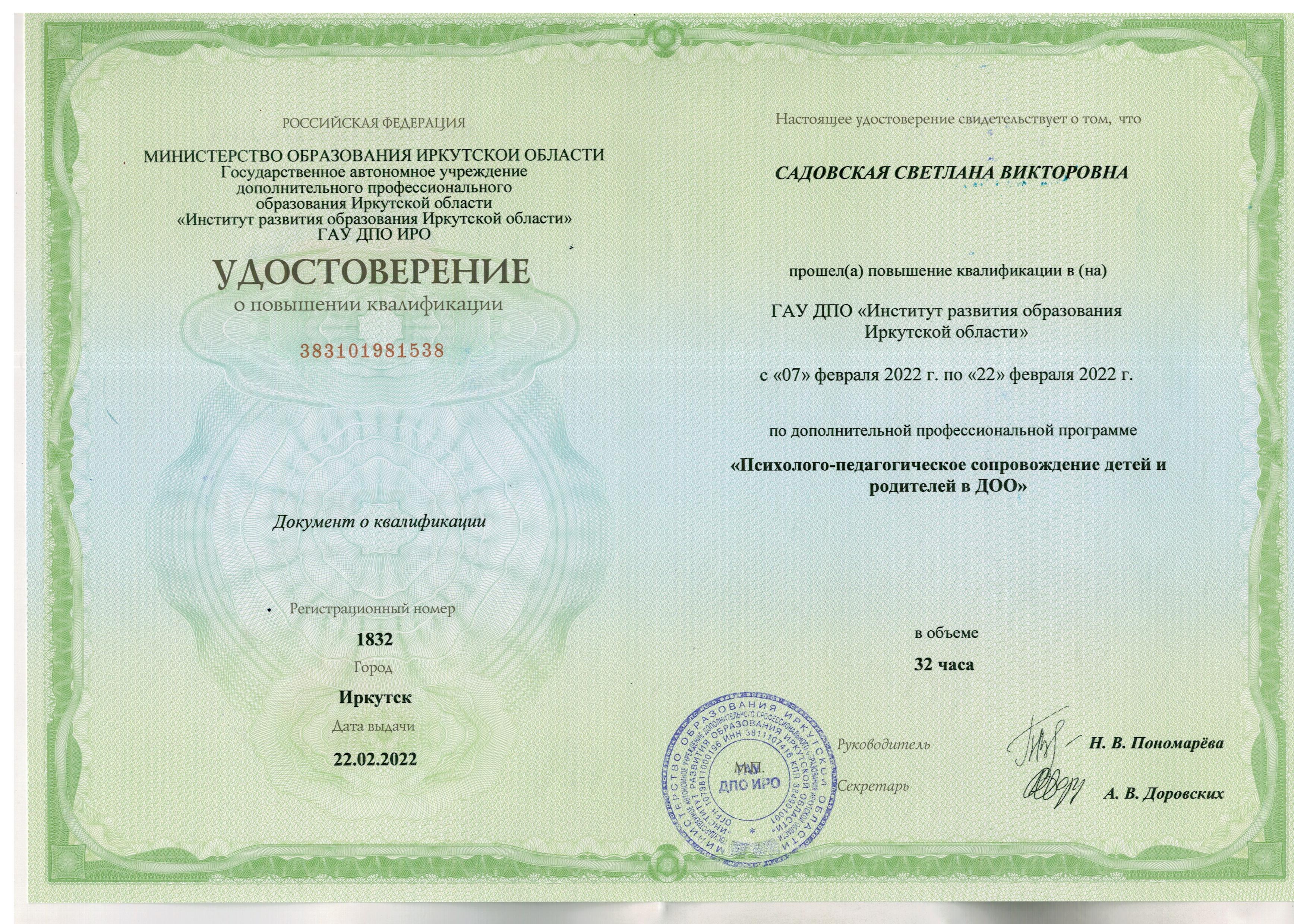 (ГАУ ДПО Иркутской области "Институт развития образования Иркутской области". 72часов. Форма обучения: очная.).