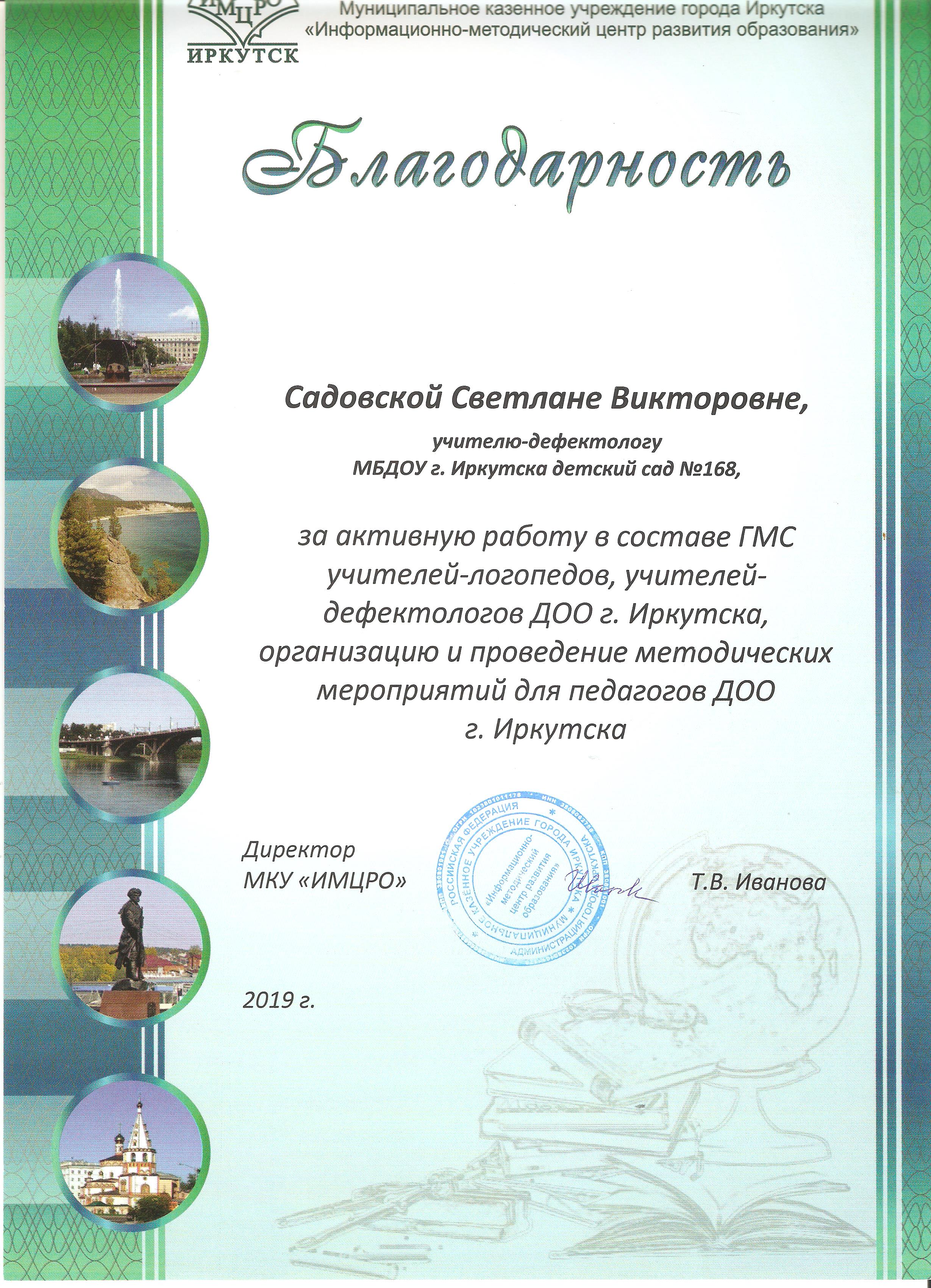Благодарность за активную работу в составе ГМС учителей-логопедов, учителей-дефектологов ДОО г. Иркутска, организацию и проведение методических мероприятий для педагогов ДОО г. Иркутска